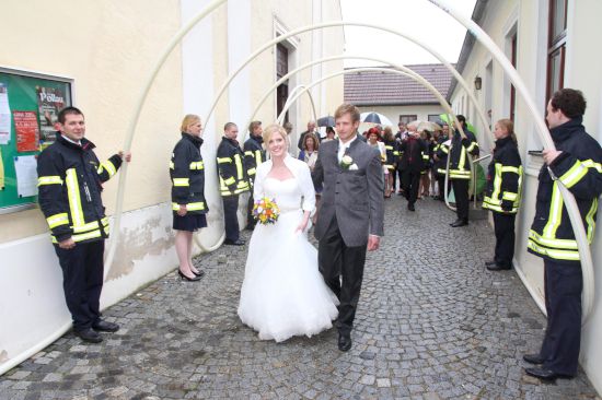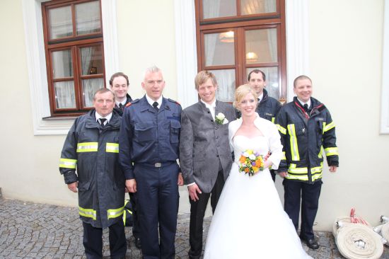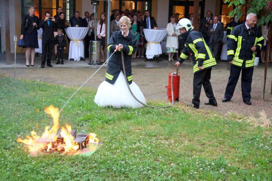 Nach der kirchlichen Trauung wurde von den Feuerwehrkameraden ein Spalier mit Feuerwehrschläuchen vor der Kirche aufgebaut. Das Kommando gratulierte dem Brautpaar und wünschte alles Gute für den gemeinsamen Lebensweg. Anschließend wurden vom Brautpaar einige schwierige Aufgaben gemeistert. Nachdem ein Baumstamm durchgesägt werden mußte, hatte das Brautpaar ein Holzhaus im Vollbrand zu löschen.