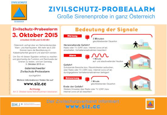 Am Samstag, 3. Oktober 2015, wird wieder der österreichweite Zivilschutz-Probealarm vom Bundesministerium für Inneres (BM.I) durchgeführt. Der Probealarm soll Sie mit den Zivilschutz-Signalen vertraut machen und gleichzeitig die Funktion und Reichweite der über 8.200 Sirenen testen.