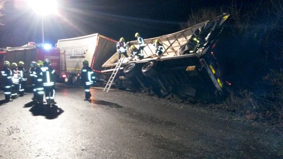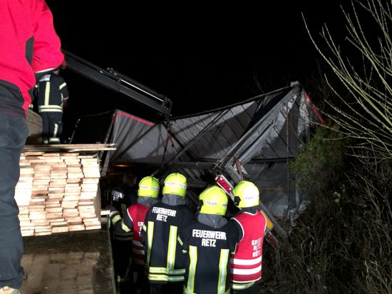 Am Dienstag, den 1. Dezember 2015, wurde die Feuerwehr Retz zu einer LKW-Bergung zwischen Retz und Klein Höflein alarmiert. Ein Lenker mit seinem LKW samt Anhänger war aus unbekannter Ursache in das Bankett gekommen und stecken geblieben. Beim Eintreffen wurde erste Absicherungsmaßnahmen durchgeführt und mit der Erkundung begonnen.