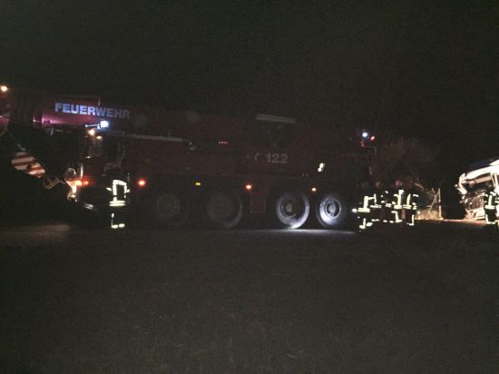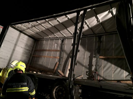 Aufgrund der schweren Beschädigung des Zugfahrzeuges und da der beladene Anhänger umgekippt war, konnte eine Bergung mit den Mitteln der Feuerwehr Retz nicht durchgeführt werden. Zur Unterstützung wurden die Kranfahrzeuge die Feuerwehr Hollabrunn nachalarmiert. Um das LKW-Gespann aus dem Bankett zu ziehen mußte zuerst der Anhänger umgeladen werden.