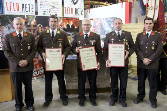 Weiters wurde das frühere Kommando der Feuerwehr Retz für ihre Tätigkeit im Feuerwehrwesen geehrt und für ihre Leistungen Urkunden überreicht. BR Ing. Christian Lehninger für 11 Jahre Kommandant, OBI Manfred Kiesling für 10 Jahre Kommandant-Stellvertreter sowie OV Gerhard Lutzer für 4 Jahre Verwaltungsleiter und 13 Jahre Jugendbetreuer. Die Verdienstmedailie 3. Klasse des Niederösterreichischen Landesfeuerwehrverbandes wurde an EDV-Sachbearbeiter Franz Löscher überreicht.